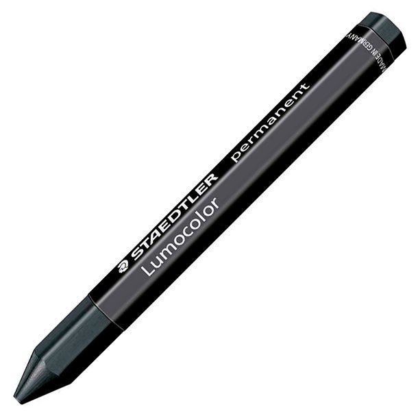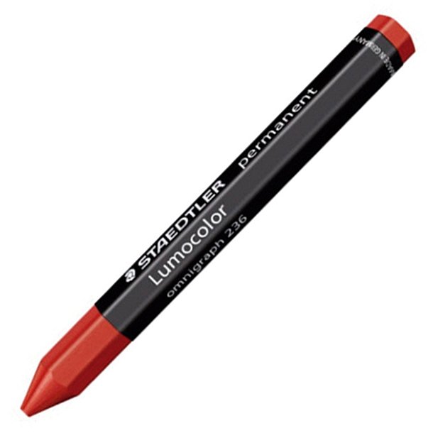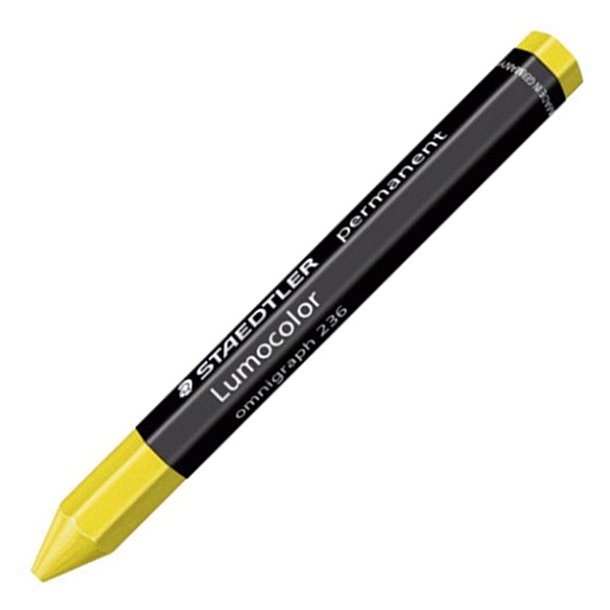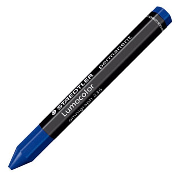 Crayón de cera universal y resistente al agua en casi todas las superficies. Cubre superficies transparentes, claras y oscuras. No se seca. No traspasa el papel. Caja de 12 unidades.
